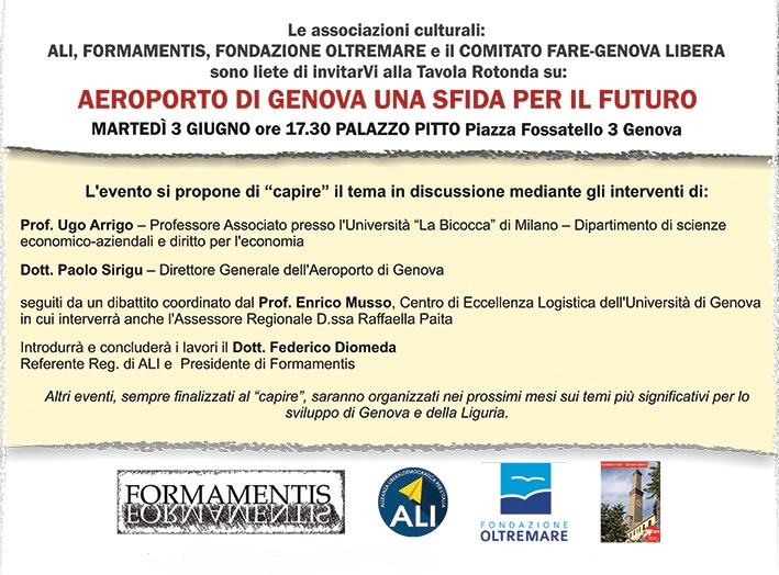 Il 3 giugno si è svolto a Genova, a Palazzo Pitto l’incontro “Aeroporto di Genova. Una sfida per il futuro”, organizzato dalla associazioni culturali ALI, Formamentis, Fondazione Oltremare e Comitato Fare-Genova Libera. Lo scopo della discussione è stato quello di definire le prospettive dello scalo genovese, di fronte a dati che indicano una flessione sensibile del numero di passeggeri, ponendosi in controtendenza rispetto alla media nazionale, e di analizzare esigenze e proposte dei vari stakeholders coinvolti.