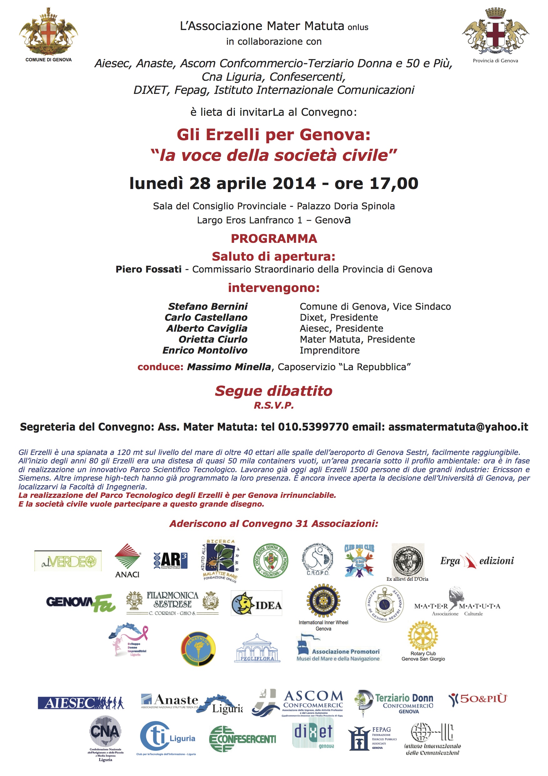 Lunedì 28 aprile alle ore  17.00, presso la Sala del Consiglio Provinciale di Genova a Palazzo Doria Spinola, si terrà il convegno ” Gli Erzelli per Genova: la voce della società civile”, un incontro per fare il punto sulla situazione del Parco Scientifico e Tecnologico degli Erzelli. Il dibattito, a cui interverrano come relatori Erzelli: convegno in Provincia a Genova